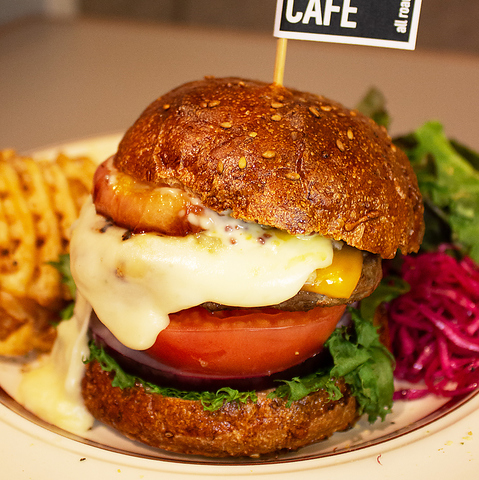 チェダーのコクとモッツァレラのとろける食感が重なり合う、チーズ好きのための濃厚バーガー(アレルギー表示: 小麦・たまご・乳)