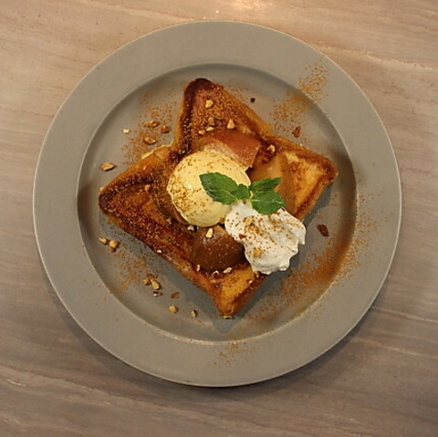 大分ブランド卵「蘭王」で作ったふわとろ食感のフレンチトーストに、シナモンの香りをまとった温かい焼きりんごを贅沢にトッピング。熱々のトーストと冷たいバニラアイスの絶妙な温度差、りんごの食感が織りなす、至福のカフェタイムデザートです。