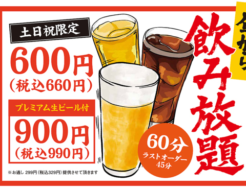 土日祝日限定!60分600円から飲み放題OK♪昼からお得に飲み放題やってます。