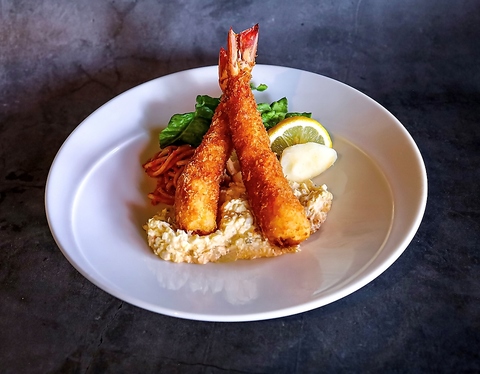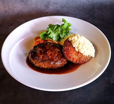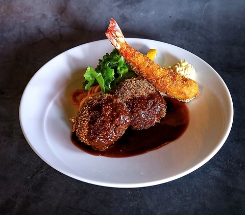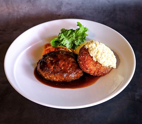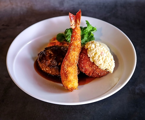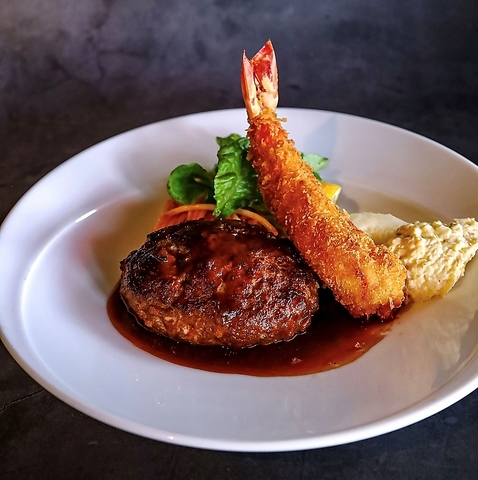 大海老を使用しておりぷりぷり食感の海老フライを自家製タルタルソースと共にお楽しみいただけます。ハンバーグステーキは黒毛和牛を使用、肉肉しい食感をのこし、最大限にジューシーさを楽しんで頂けるよう仕上げました。ぷりぷり海老フライとハンバーグの絶妙なハーモニーをお楽しみください。