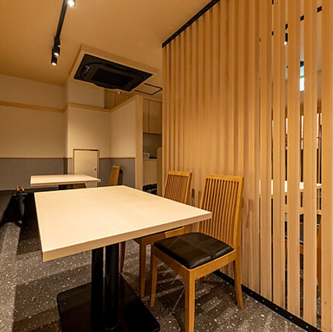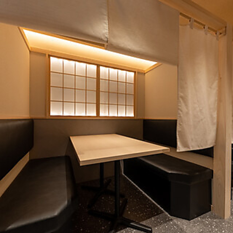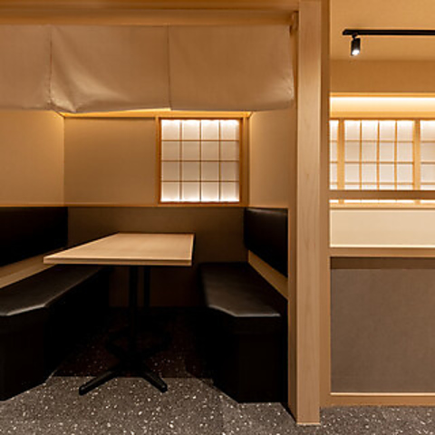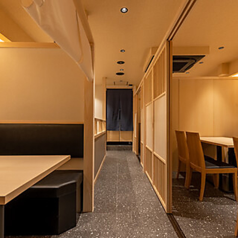 上品で落ち着いた雰囲気が魅力の店内。暖簾がおしゃれな半個室は、隠れ家のような特別な雰囲気を醸し出しています。周囲と仕切りがあるため、プライベート感を重視したいお客様にもおすすめ。ご家族でのお食事や大切な方とのデートなど、満ち足りた時間をお過ごしいただけます。