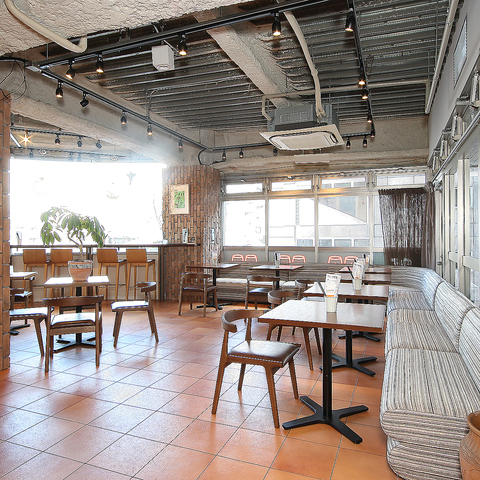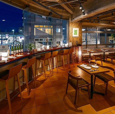 【デートや女子会での利用に最適!】広々としたちょっと暗めなこだわりの空間で様々なシーンに対応可能。窓側のカウンター席で外を見渡しながらのデート!ソファー席もご用意しているので女子会やご家族での利用もできます。バースデープレートのご用意も可能です。お祝い事での利用にもお使い頂けます。