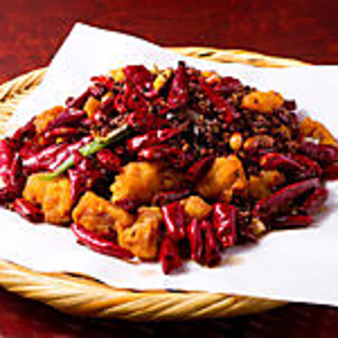 【薬膳激辛鶏肉揚げ炒め】花椒の“麻”と唐辛子の“辣”が鮮烈に立ち上がる本格四川系の一皿。高温の油で“カリッ”と揚げた鶏肉は、中は肉汁を閉じ込めたジューシーな仕上がり。薬膳スパイスの深い香りが重層的に広がり、辛さの中に旨味が際立つ構成。辛党だけでなく、香り豊かな中華を求める方に強く刺さる看板メニュー