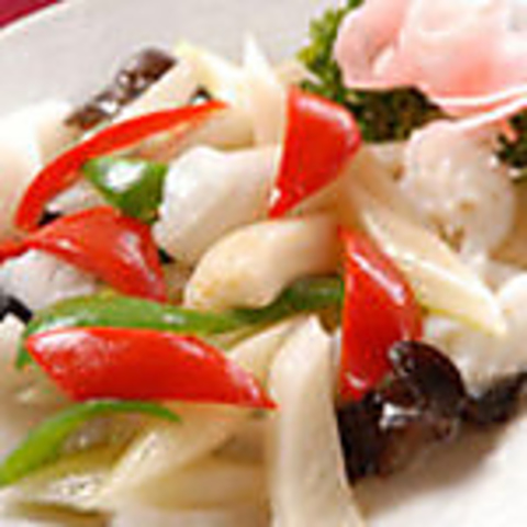 【セロリといかの塩味炒め】中国料理の基本技法“清炒”で仕上げる、素材本来の旨味が際立つ一皿。鮮度の高いイカは短時間の強火調理で“プリッ”と弾力を残し、セロリの爽やかな香りとシャキシャキ感が全体に清涼感を与える。シンプルながら洗練された塩味のまとまりは中華料理の火入れ技術の高さを感じる上品なメニュー