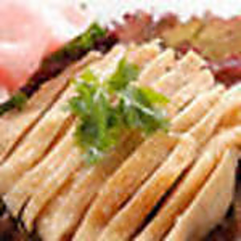 【バンバンジー】しっとり火入れした蒸し鶏に、自家製の胡麻ダレをたっぷりかけた中華“涼菜”の王道。芝麻醤の濃厚なコクに、香味野菜と辛味を最適にブレンドし、奥行きのある味わいに仕上げている。口当たりはまろやかで食べやすく、飽きずに食べ進められる一品。季節問わず活躍する万能メニュー