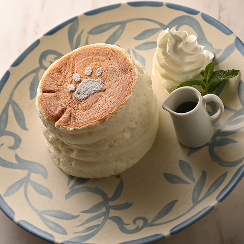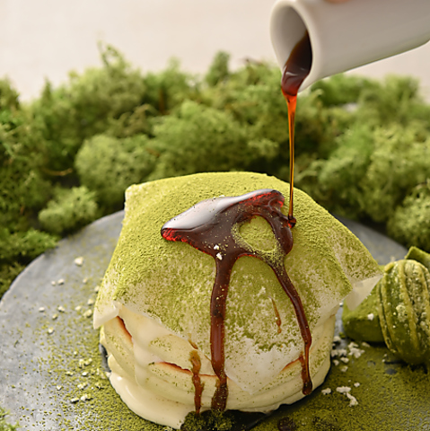 当店自慢のふわふわパンケーキにこの度新メニューが追加されました!詳しくはSNSをチェックしてください!【抹茶と黒蜜の和みパンケーキ】はふわふわに加えもっちり食感も楽しめる新レギュラーメニュー!ほろ苦い濃抹茶をたっぷりまぶしたのでとろーり黒蜜をかけてお召し上がりください!