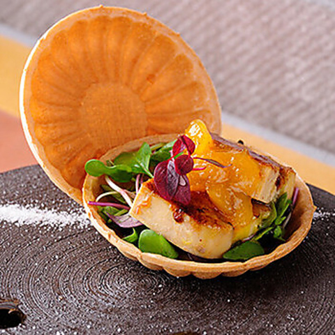 フォアグラを最中で包み、季節のクラフトジャムを添えた名物「フォアグラ風最中」。濃厚でとろけるフォアグラの上質な旨味と、甘酸っぱいジャムが織りなす和洋折衷の調べ。居心地の良いおしゃれ空間で、厳選した国産ドリンクとのペアリングを心ゆくまでお楽しみください。