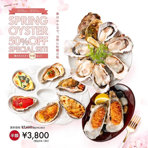 3 /23~3/31。旬の生牡蠣6P、焼き牡蠣6種、カキフライ2P、人気のメニューが半額セットでご提供いたします!
