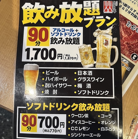 今宵は炭火焼肉 キョロちゃんで楽しく宴♪そんな日におすすめなのが、選べる2種の単品飲み放題です!アルコール+ソフトドリンク、ソフトドリンクのみの飲み放題をご用意しております。皆様のご来店をお待ちしております◎
