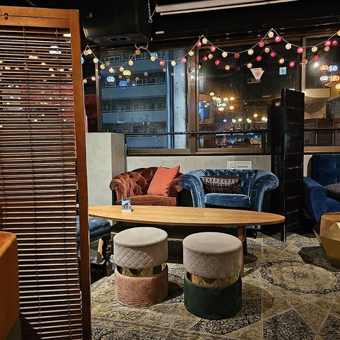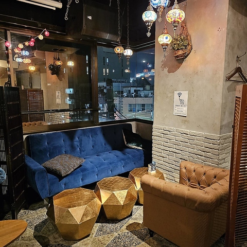 【ソファ×夜景】大宮の夜景が見える窓際のお席です。店内のカラフルなトルコランプがお席を彩ります。