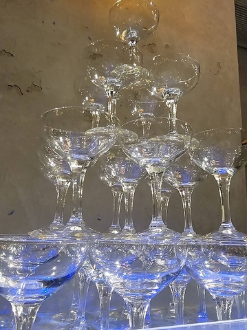 事前のご予約でグラス30個4段のシャンパンタワーをご用意できます。通常ボトルは当店お任せスパークリングワインボトル3本となりますが、オプションでお好みのシャンパンに変更可能です☆