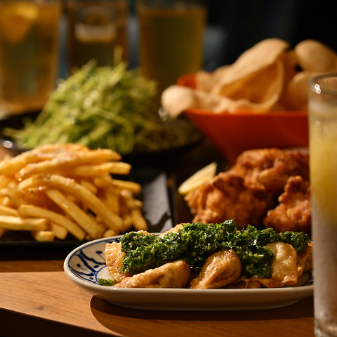 大山鶏のから揚げやチリポテト、豆苗のオイスター炒めなどなど、お酒に合うおつまみ一品メニューが充実!承認数でも大人数でも、パーティーが盛り上がること間違いなし!