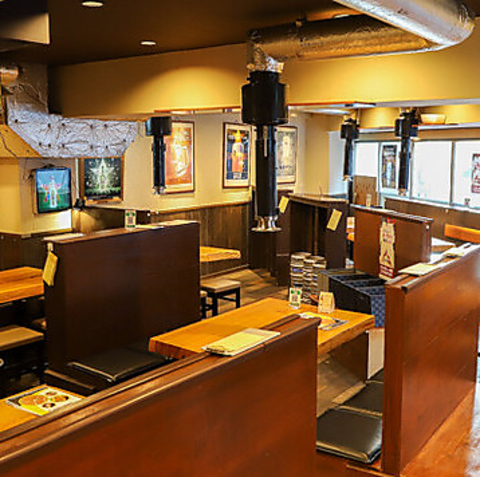 宴会に最適な広々空間をご用意し、テーブルごとに七輪を備えています☆大人数様にも対応できるレイアウトで、団体利用でも快適!木目調が落ち着くインテリアと穏やかな照明が、焼肉時間をより楽しく演出します◎賑やかなひとときをお過ごしください♪