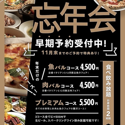 | 備考 | ■コスパ抜群の本格イタリアンを堪能■食べ飲み放題コース2時間3,800円~■アラカルト400円~ ※税込価格 |