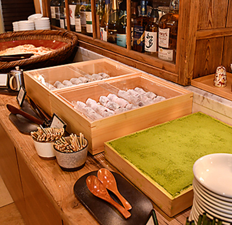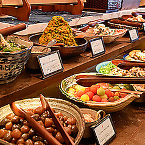 地元の食材はもちろん、全国各地からの旬の食材を取り入れ、手作りしたお惣菜も全て食べ放題です!およそ15種類ほどのお惣菜やお漬物が色鮮やかに並びます。季節や時期によって変わるメニューを心ゆくまでご堪能ください。お好きなものをたくさん楽しむも良し、いろんな種類を少しずつ楽しむのも良し◎新鮮野菜もご用意あり