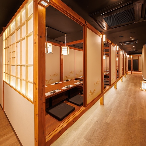 【扉付き完全個室】和の情緒溢れるお席はトビラ付き完全個室、仕切りを外して大人数の宴会でもご利用頂けます。ゆったりと足を伸ばしてくつろぎながら、当店自慢の料理やお酒をお楽しみ下さい。飲放題付きの宴会プランも各種ご用意しており、コース値引きなどお得なクーポン券もご利用いただけます♪