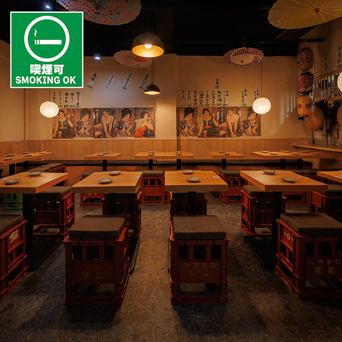 【全席喫煙可能】レトロな和モダンの店内では、木の温かみ溢れた落ち着いた雰囲気でお食事をお楽しみいただけます。店内は喫煙可能となっておりますのでおタバコを吸われる方にも人気◎楽しい会話が途切れることなくご友人とのお酒の席をお楽しみいただくことができるお店となっております◎
