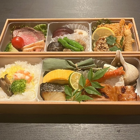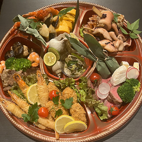 ローストビーフ、焼き魚(鰆西京焼)、海老のカダイフ揚げかきフライ、越の鳥照り焼き、バイ貝酒蒸し旬の焚き合わせ、いか串焼、出汁巻き玉子、甘味※2人前より承ります。2日前までにご注文ください。※金額、内容などご要望にお応えしますのでお気軽にお問い合わせください。※受け渡し時間11時~/配達不可