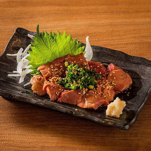 加熱処理したレバーを使用し、しっとり濃厚な食感とごま油の香りがクセになる名物メニュー!お酒との相性抜群!