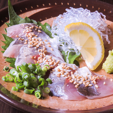 新鮮だからこそできる≪刺身≫◆今の時期に脂がのってくるアジをつかって、ごまアジをご用意。程よい弾力と旨味が口の中に広がります。ごまワサビや大葉と一緒にと食べると香りも相まって旨味がさらに増してきます。好みのお酒と一緒に!大人気で品切れ必至の逸品です!