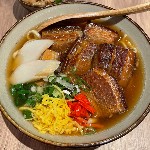 何を注文しようか迷われたら沖縄料理の定番品『ラフテー』をどうぞ!大きくカットした豚肉のかたまりを醤油・砂糖・出汁・泡盛とともに約8時間コトコト煮込んでお作りしました。泡盛で煮込むのは沖縄地方ならでは。お箸ですっと切れるほど柔らかく、じっくり煮込んだお肉は舌の上でトロッととろけます♪