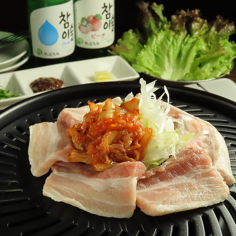 旨味が詰まった肉から滲み出る肉汁と油でキムチを焼くと更に美味しくなります。香ばしい旨味と甘みをサンチュで巻いて召し上がって下さい。