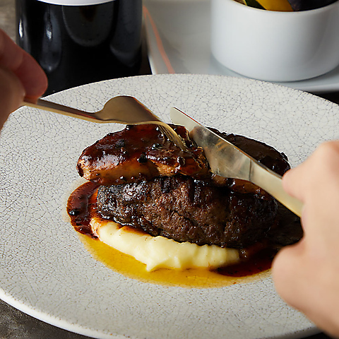 俺のシリーズの名物であり名作の「フォアグラのロッシーニ」は俺のステーキでもご堪能いただけます♪俺のステーキでは当店が自信を持って提供する松阪牛入りハンバーグと組み合わせました!!【渋谷 センター街 俺の 和牛 黒毛和牛 ステーキ ハンバーグ 松阪牛 炭火 宴会 女子会 忘新年会 飲み会 飲み放題 貸し切り ランチ】