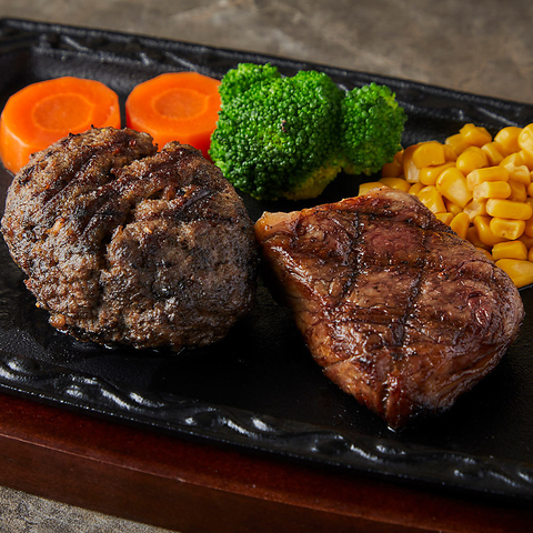 当店人気No.1のハンバーグ&ステーキコンボ!!ハンバーグは松阪牛入りでつなぎ不使用の牛100%で作られた肉肉しい旨味がガツンとくるこだわりの一品。さらにステーキは国産A5ランク黒毛和牛と一挙に楽しめる贅沢セットに♪ハンバーグ180g、ステーキ100gとボリュームも満点!!