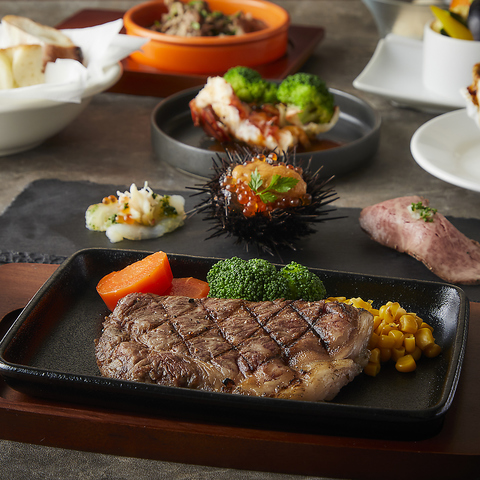 ステーキの本場・アメリカ産のアンガス牛を使ったハラミステーキコースです。和牛と比べてたんぱく質やビタミンB、鉄分が多くてヘルシーなのが特徴。牛の横隔膜であるハラミは分類上ホルモンになりますが、赤身肉に似た見た目で弾力がありながらも柔らかい食感で食べ応えが抜群です。一頭から少量しかとれない希少部位のハラミは噛む度に口内に広がる牛の旨味が人気の秘密。