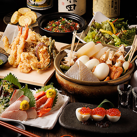 コスパ崩壊の【タンの里久6000円】は「生たんゆっけ」名物を中心に、前菜から刺し身5種盛り・炉端焼き特大車海老串・デザートまで楽しめる充実プラン。当店の二大名物を一度に楽しめるスペシャルセット。香ばしく焼き上げたコリッとした牛タン串と、じっくり煮込んだほっこり優しいおでんの絶妙なハーモニー。お酒はもちろん、ご飯にもよく合う嬉しい一品です。楽しめます。