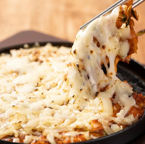 外はカリッ、中はとろ~り。とろけるチーズの旨みがたまらない「チーズチヂミ」が人気です!お酒との相性も抜群で、リピーター続出。ぜひお試しください♪