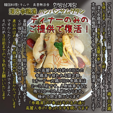 Xmasディナーコース提供期間12月23日(火)・24日(水)・25日(木) の3日間7種類の真善おまかせ韓国料理の内容1,タッカンマリ(1羽・2人分)2,キムチ、小皿3,チャプチェ、小皿4,チヂミ(キムチ)5,ナムル 2点盛6,キンパ 3piece7,しめのデザート詳細は「コース」のページを参照ください