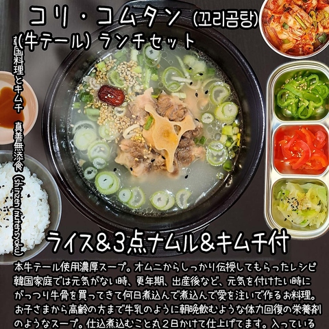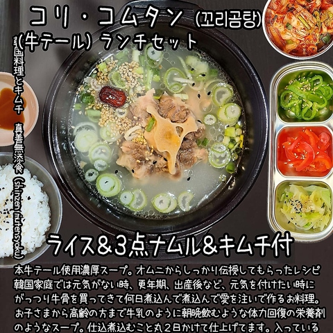 セット ご飯&ナムル3点盛り&キムチ付。本物牛テール使用。主役は濃厚スープ。オムニ伝授してもらった韓国家庭では元気がない時、更年期、出産後など、元気を付けたい時にがっつり牛骨を何日間も煮込んで煮込んで愛を注ぐ。牛テールはしゃぶりついてお召し上がり頂くことで、美味しい。濃厚スープはクッパにして頂く絶品