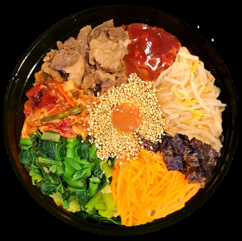美味しい秘伝のコッチュジャン!色どり具材をお楽しみください。ビビンバは、韓国料理の一つ。丼や専用容器にご飯とナムルや肉、卵などの具を入れ、よくかき混ぜて食べる料理で、コチュジャンやごま油などの調味料をかけ、匙(スッカラク)でよく混ぜてから食べます。
