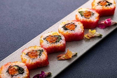 平日限定のランチメニュー!HANABIロールは、まるでお寿司の中で虹が踊っているかのような鮮やかな美しさ!色とりどりの新鮮な具材が絶妙に組み合わさり、一口食べれば幸せが口いっぱいに広がります。ディナータイムはHANABIロール単品もご用意!
