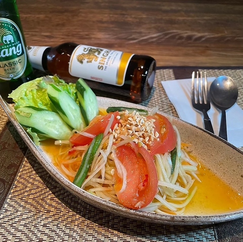 青パパイヤを主役にしたタイ料理の代表格で、甘味/酸味/辛味の絶妙なバランスが魅力。サラダの一部で使われる「プラーラー」は、魚を塩漬けし発酵させて作るイーサーン地方特有の調味料。発酵の過程で深みのある旨味が生まれ、ライギョを使ったものが特に一般的です!風味豊かな「ソムタムバラ」もぜひお試し下さい。タイの本格的な味をご堪能。