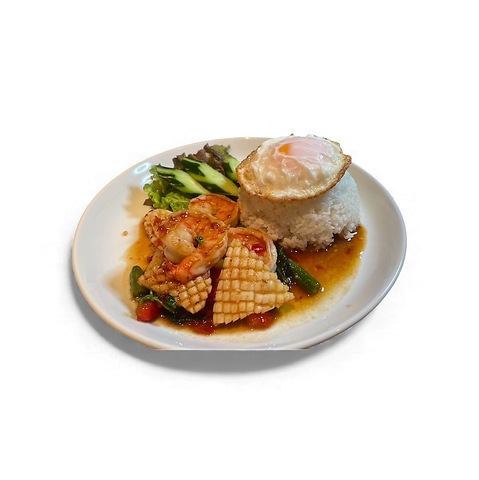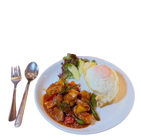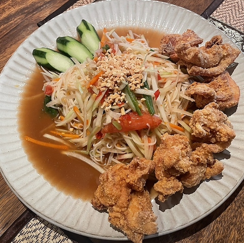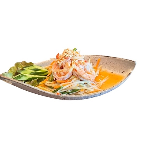 青パパイヤを主役にしたタイ料理の代表格で、甘味/酸味/辛味の絶妙なバランスが魅力。サラダの一部で使われる「プラーラー」は、魚を塩漬けし発酵させて作るイーサーン地方特有の調味料。発酵の過程で深みのある旨味が生まれ、ライギョを使ったものが特に一般的です!風味豊かな「ソムタムバラ」もぜひお試し下さい。タイの本格的な味をご堪能。