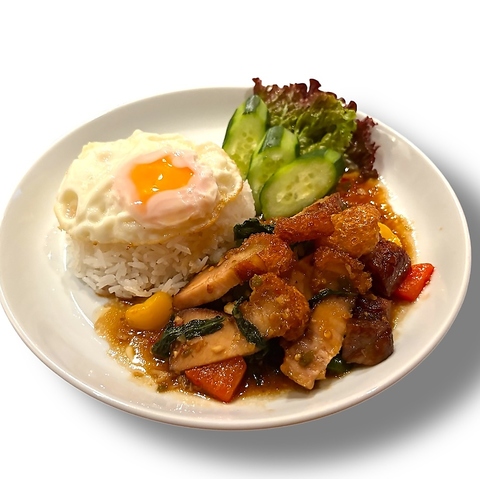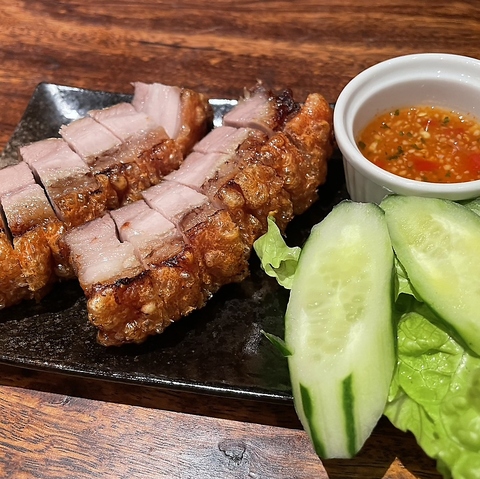 豚肉を、じっくり揚げて外側をカリカリになるまで仕上げました。口の中でお肉の旨味が一気に溢れ出ます◎カリカリとした歯ごたえがついつい癖に♪4時間以上仕込みを行うこだわりの逸品です。スペシャルソース付けてお召し上がり下さい!(ガパオライスにも作ることが可能です。)この機会に本格的なタイ料理を食べてみませんか?