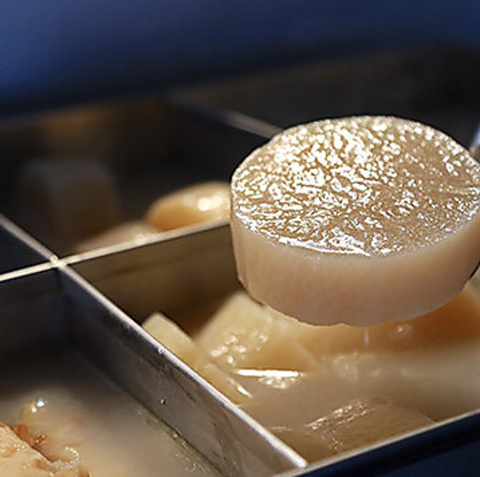 じっくりと時間をかけて旨味を凝縮させた「鶏だしおでん」は、優しい味わいが自慢の逸品です◎大根や玉子など、出汁が染み込んだ具材はどれもお酒が進む美味しさ♪落ち着いた木目調のテーブル席で、熱々のおでんを囲みながらゆったりとしたひとときを過ごせます◎お仕事帰りの一杯にもぴったりの一皿です♪