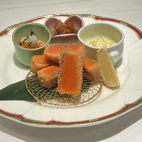 外はサクッ、中はとろける極上レア仕立て。ここでしか味わえない一皿。自家製タルタルソースやわさびでお召し上がりください。