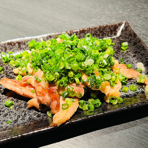 鉄板でプリプリに焼き上げ、その上にたっぷりのネギをかけました。塩ダレがかかっておりますので、ネギと塩ダレだけでもおつまみになるので最後までお楽しみいただくことができます♪