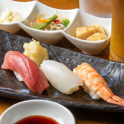 夕方のひとときを、ちょっと贅沢に。店主が厳選した旬の鮮魚を握り寿司で3貫、さらにお好きなドリンク2杯が付いて 1,980円!仕事帰りや待ち合わせ前に、気軽に本格寿司とお酒を楽しめる特別プランです!