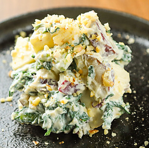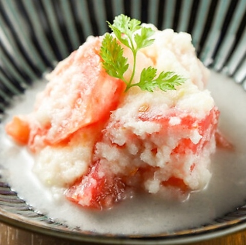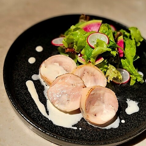 日本酒に合う創作料理としてご用意している料理は、どれも洗練された味わいと美しい盛り付けが特徴です。厳選した食材を使用し、シンプルながらも深い味わいを引き出すことにこだわってます。こちらは炙りチキンにわさびのクリームソースを添えており滑らかな舌触りが全体のバランスを整えています。日本酒とともにお楽しみいただける一品です。
