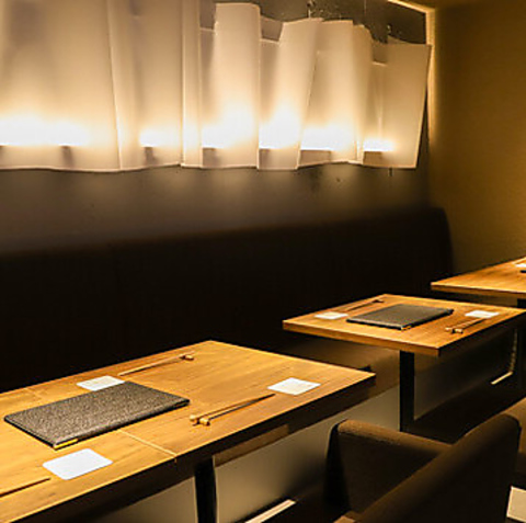 高級感のある落ち着いた雰囲気が漂うテーブル席を10席ご用意しております。ご家族や気の合う仲間との集まりに最適なお洒落な空間で、心地よい会話と共にお食事をお楽しみいただけます。落ち着いた照明と木の温もりを存分に感じられる心安らぐ雰囲気の中、至福の時間をお楽しみください。