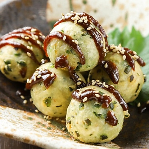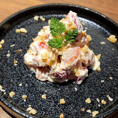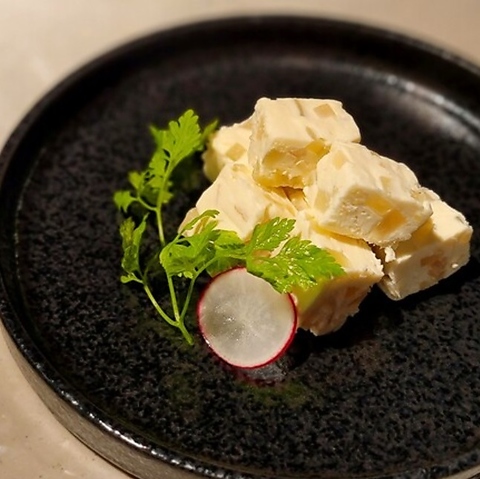 日本酒に合う創作料理としてご用意している料理は、どれも洗練された味わいと美しい盛り付けが特徴です。厳選した食材を使用し、シンプルながらも深い味わいを引き出すことにこだわってます。こちらは炙りチキンにわさびのクリームソースを添えており滑らかな舌触りが全体のバランスを整えています。日本酒とともにお楽しみいただける一品です。