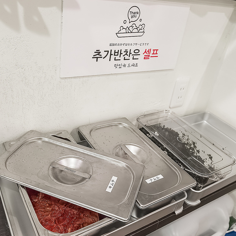 当店キムチ、ナムル、韓国のりはお代わり自由でセルフサービスでご提供しておりますのでぜひお好きな量でおかずもお楽しみくださいませ♪