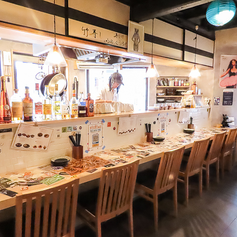お店に入ると、目の前に広がるのは活気あふれるカウンター席。お一人様や少人数のお客様でも気兼ねなくお食事を楽しむことができます。また、ゆったりとくつろげる4名様用のテーブル席もございますので、ご家族やご友人とのお食事にも最適です!アットホームな雰囲気の中で心ゆくまでお食事と会話をお楽しみください♪