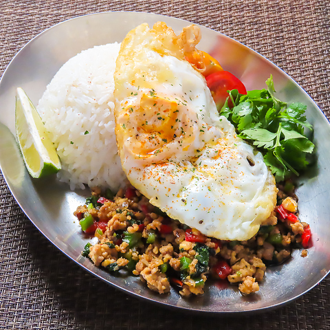 本場タイの味を忠実に再現するため、バジルや魚醤など厳選した調味料を使用し、丁寧に炒めております。香ばしい香りと、鶏肉の旨味、くせになるピリッとした辛さが食欲をそそり、一口食べたら止まらなくなること間違いなし☆目玉焼きを崩して混ぜながら食べると、まろやかさが加わり、また違った味わいを楽しめますよ。
