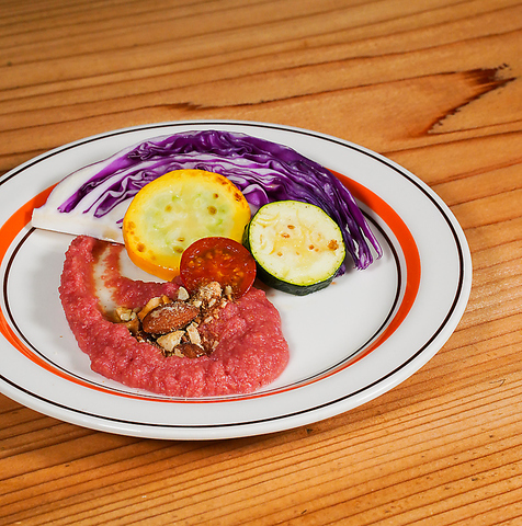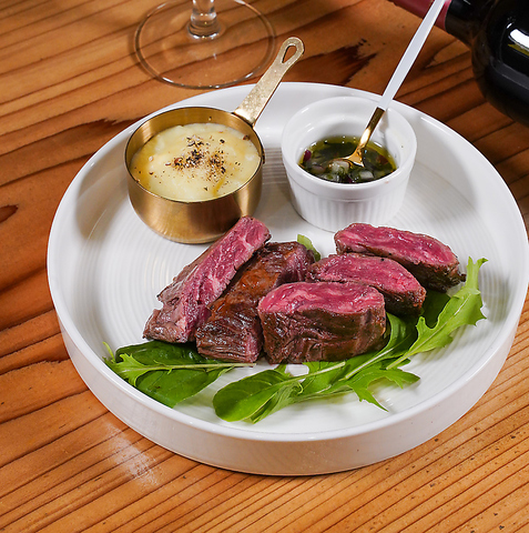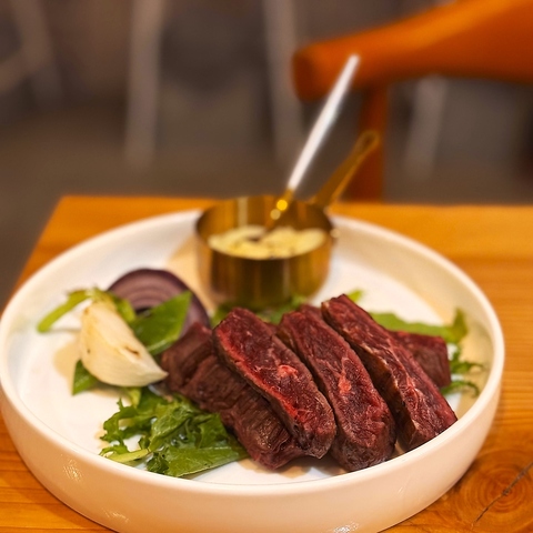 南米のステーキ文化、ビネガーと香草のチュミチュリソース。修業時代に教わったこの味は赤身のハラミをさっぱり、ぺろりと食べさせてくれます。丁寧にお肉を焼き上げ旨味を最大限に、最後の一口まで爽快な自慢の一皿です。