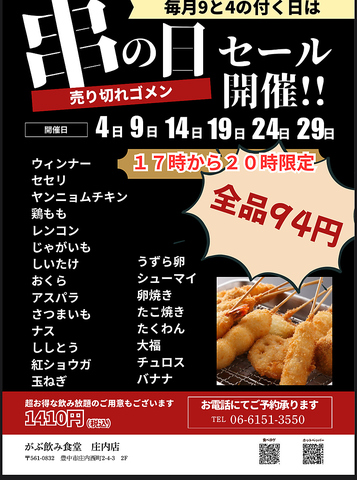 9と4がつく日は串カツがオトク!!1本94円~種類も充実でコスパ最強◎